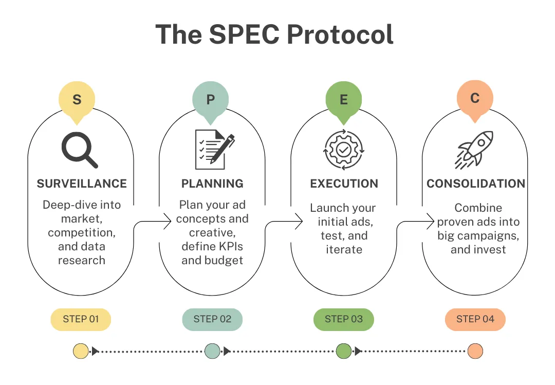 The Solution: A Protocol that simplifies and streamlines scaling. The SPEC Protocol is built off of the core idea that managing your marketing should be boring. No drama, just predictable profit.