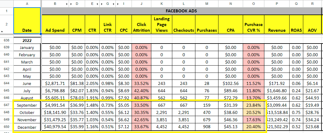 The CVR from September to December shot up compared to the 3 months prior – it would be well worth revisiting those ads and seeing what elements could be used in new campaigns.