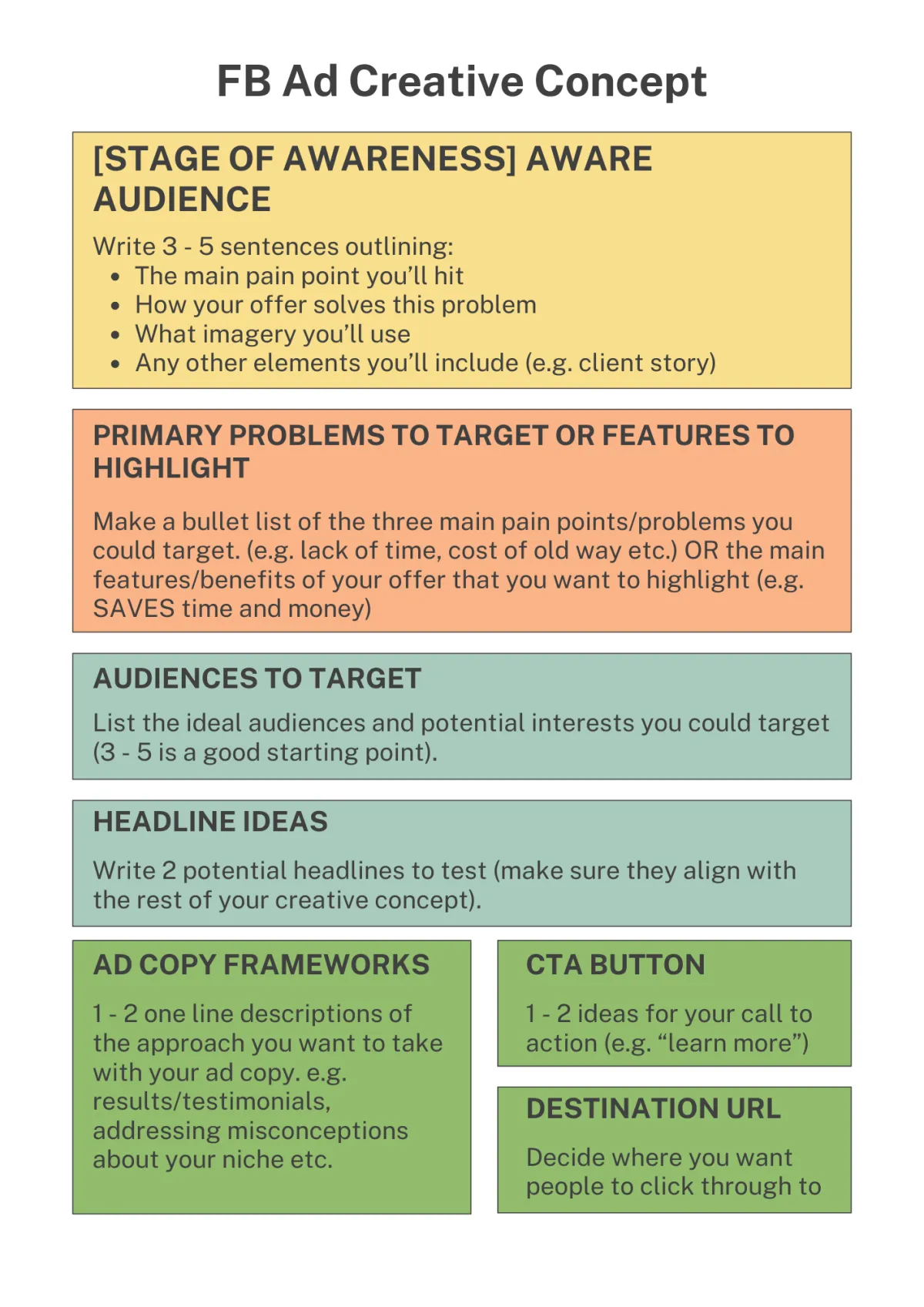 I like to do a simple one page write-up outlining the approach I’m looking to take. I do one for each viable stage of awareness (e.g. if you’ve found that “solution aware” and “niche aware” are your meatiest audiences to target, write a creative concept for each.)