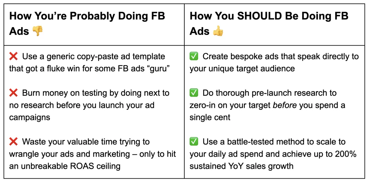 But it ONLY works for businesses that are already deep into Facebook ads and are looking to take their performance from okay to fantastic. (i.e. you’re already investing a significant amount into FB ads (or have previously), but have hit a scaling ceiling.)